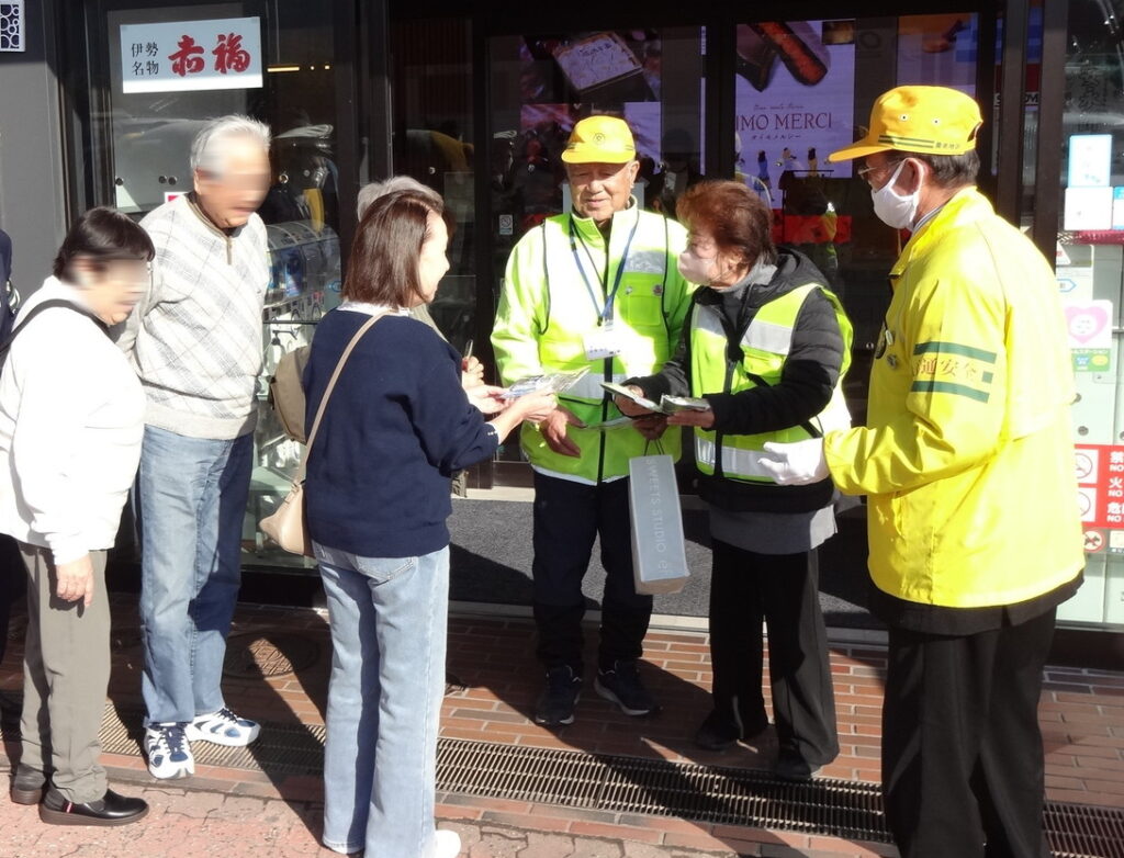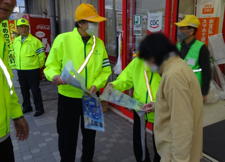 岐阜北地区交通安全協会早田支部では、夕暮れ時の県下一斉街頭指導日の11月17日、岐阜市島栄町1丁目地内のスーパーマーケット「ヤマナカ忠節フランテ館」店頭において、来店されたみなさんにチラシや交通安全グッズをお配りして交通安全を呼びかけました。