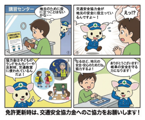 免許更新時等にご協力いただいている交通安全協力金は、お住いの地区の交通安全協会に配分し、各地区交通安全協会の交通安全活動に役立てさせていただいています。交通安全協力金の納付にご協力をお願いします。
