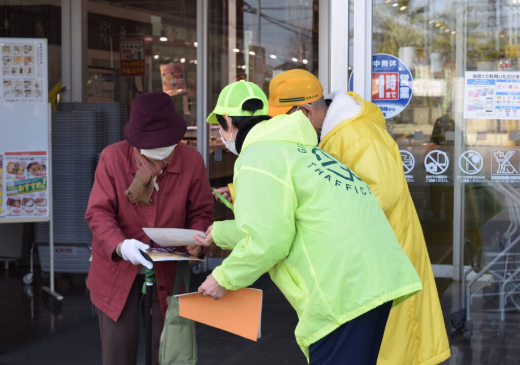 岐阜北地区交通安全協会七郷支部では、令和8年2月5日、岐阜市西改田川向地内のスーパーマーケット「オークワ西改田店」店頭において、来店されたみなさんに交通安全グッズやチラシをお配りして、交通安全を呼びかけました。