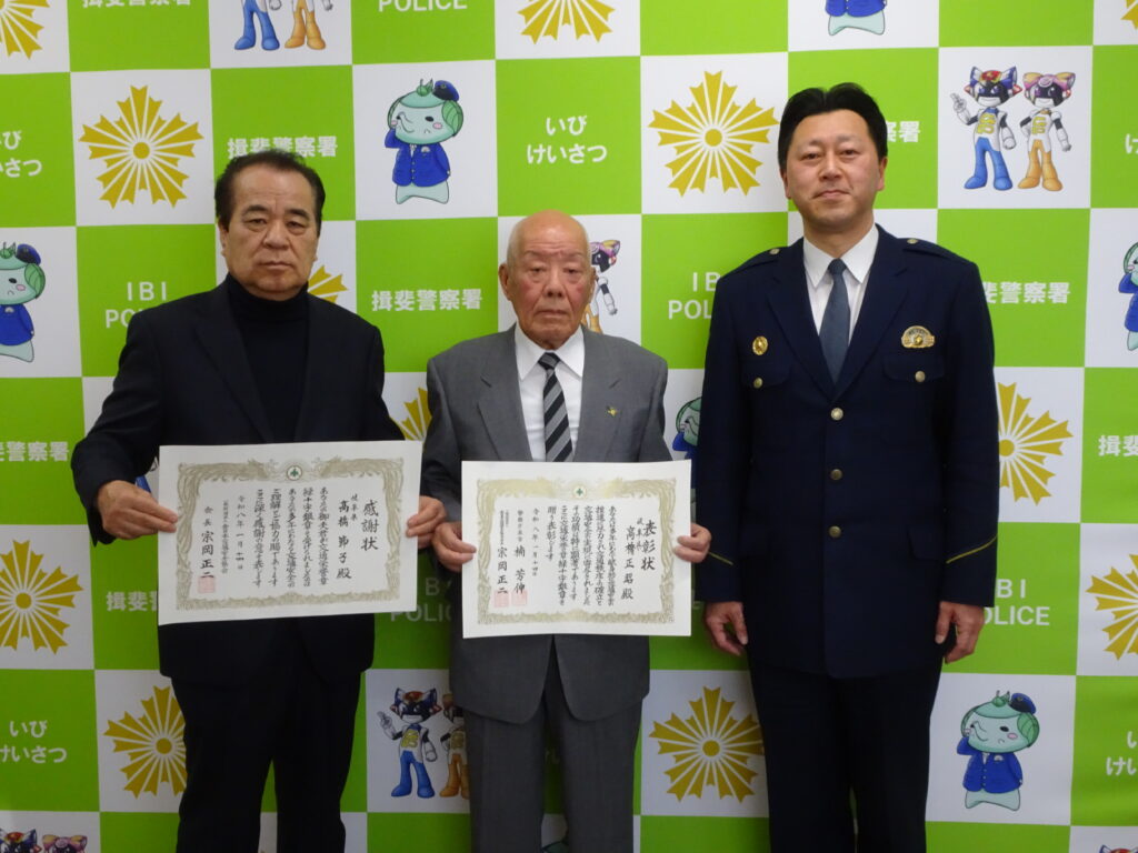揖斐地区交通安全協会から推薦を受け、交通安全功労者として交通栄誉章緑十字銀章を受章された高橋正昭さんが、令和8年1月30日、揖斐警察署を訪問し、國枝揖斐警察署長と久保田揖斐地区交通安全協会長に受章を報告しました。