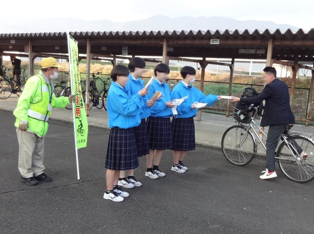 養老地区交通安全協会では、令和7年12月11日から12月20日までの年末の交通安全県民運動の活動として、令和7年12月17日、養老郡養老町祖父江向野地内の岐阜県立大垣養老高等学校において、同校MSリーダーズとともに、同校の自転車通学の生徒にチラシや交通安全グッズをお配りする等して自転車の安全利用を呼びかけました。