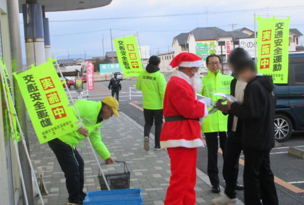 大安地区交通安全協会安八支部では、令和7年12月11日から12月20日までの年末の交通安全県民運動の活動として、令和7年12月16日、安八郡安八町東結地内のスーパーマーケット「トミダヤ結店」店頭と安八郡安八町大明神地内のディスカウントスーパー「スーパーセンタートライアル安八店」において、来店されたみなさんにチラシや交通安全グッズをお配りして、交通安全を呼びかけました。