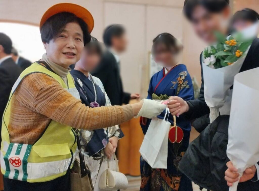 岐阜北地区交通安全協会早田支部女性部では、令和8年1月11日、岐阜市長良地内の「岐阜グランドホテル」で開催された「早田地区 二十歳のつどい」において、参加されたみなさんに交通安全グッズをお配りする等して、交通安全を呼びかけました。