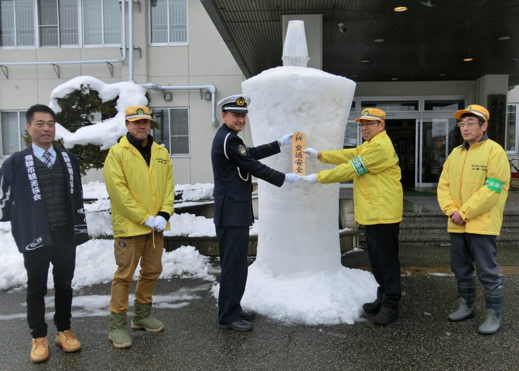 飛騨地区交通安全協会では、令和8年1月13日、飛騨警察署において開催された「雪像ろうそく」の贈呈式に参加しました。「雪像ろうそく」は、飛騨市の伝統行事で毎年1月15日に行われる「三寺まいり」に伴い制作され、このうち2基が地域の交通安全を願い飛騨市観光協会から贈呈されたものです。