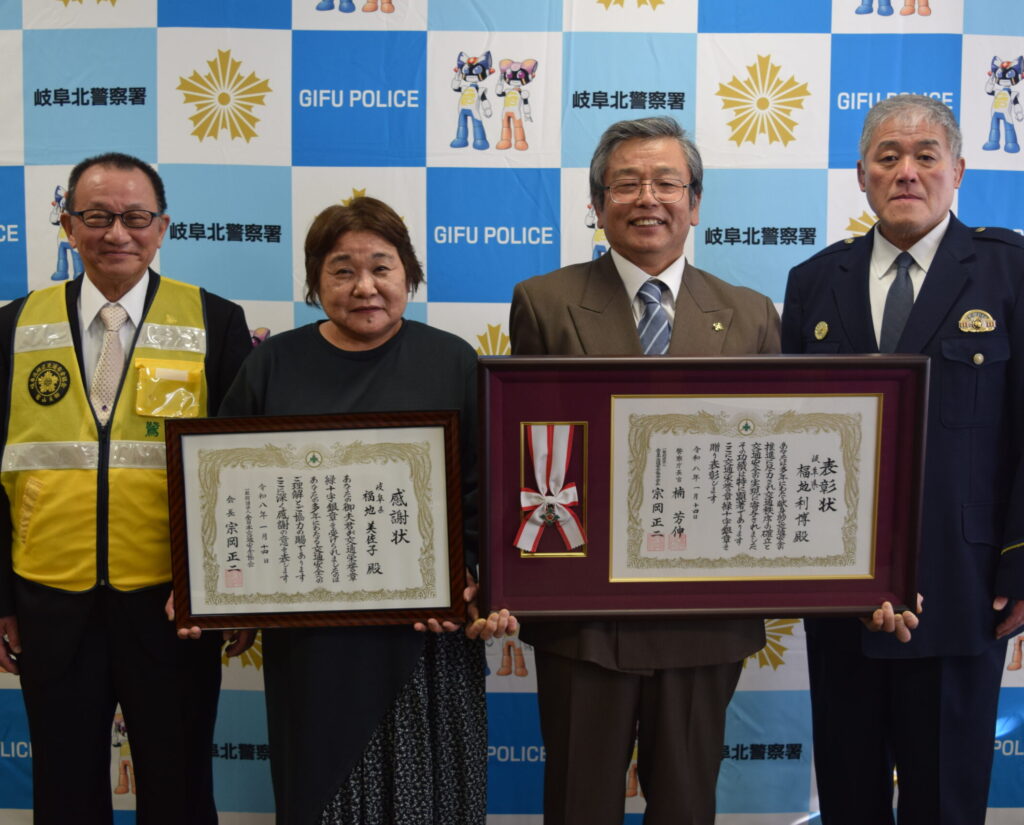 岐阜北地区交通安全協会から推薦を受け、交通安全功労者として交通栄誉章緑十字銀章を受章された福地利博さんと全日本交通安全協会から感謝状を受けられた奥様の福地美佐子さんが、令和8年1月16日、岐阜北警察署を訪問し、楠岐阜北警察署長と岐阜北地区交通安全協会副協会長に同章の受章を報告しました。