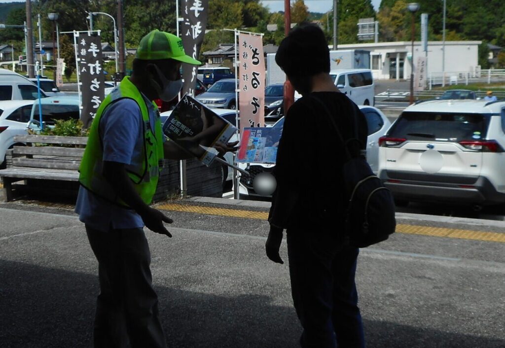 恵那地区交通安全協会では、令和7年9月21日から9月30日までの秋の全国交通安全運動の活動として、令和7年9月24日、恵那市三郷町佐々良木地内の道の駅「そばの郷らっせいみさと」において、施設利用者のみなさんにチラシや交通安全グッズをお配りして、交通安全を呼びかけました。
