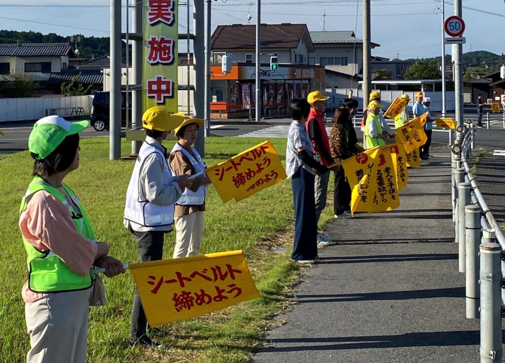 中津川地区交通安全協会福岡支部では、令和7年9月21日から9月30日までの秋の全国交通安全運動の活動として、令和7年9月22日、中津川市福岡地内の国道257号福岡交差点周辺において、交通安全旗を掲げる等して通行中のみなさんに交通安全を呼びかけました。