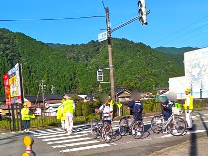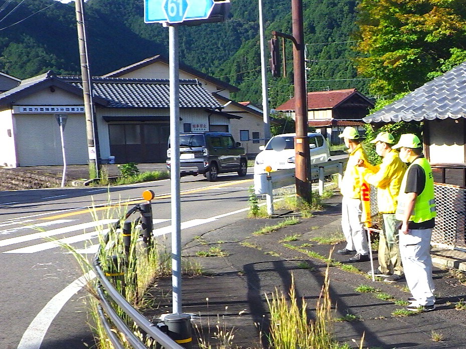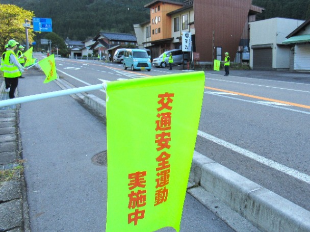 郡上地区交通安全協会明宝支部では、令和7年9月21日から9月30日までの秋の全国交通安全運動の活動として、令和7年9月22日から26日までの間、地区内の通学路や主要交差点において通学児童・生徒の見守りを行い、交通安全旗を掲げる等して、通行中のみなさんに交通安全を呼びかけました。