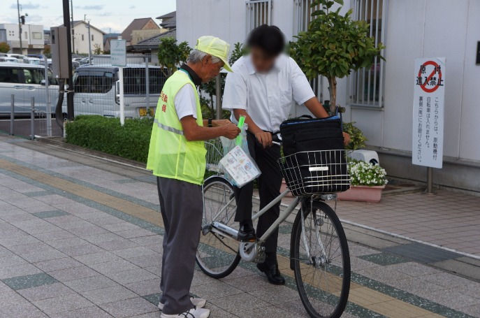 可児地区交通安全協会では、令和7年9月21日から9月30日までの秋の全国交通安全運動の活動として、令和7年9月29日、可児市下恵土2丁目地内の可児駅東自転車駐車場前において、自転車利用者のみなさんにチラシや交通安全グッズをお配りして自転車の安全利用を呼びかけました。