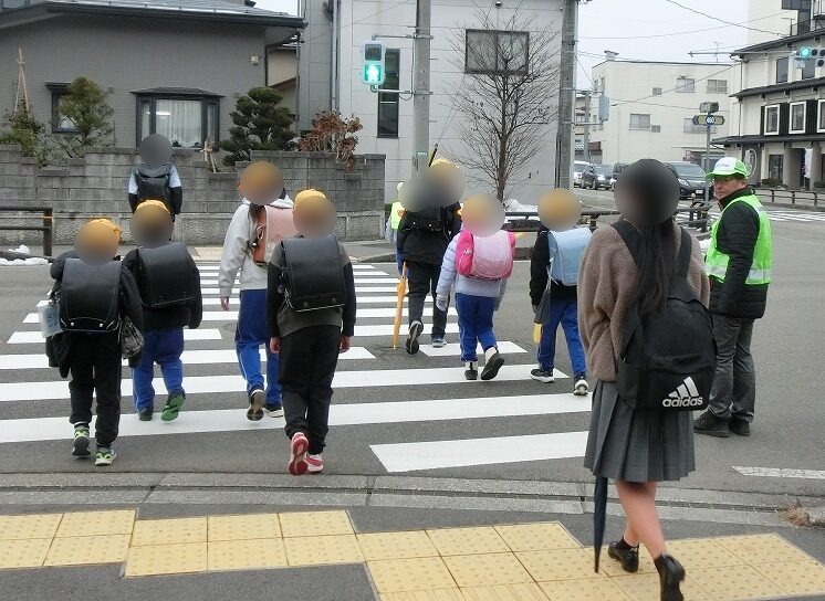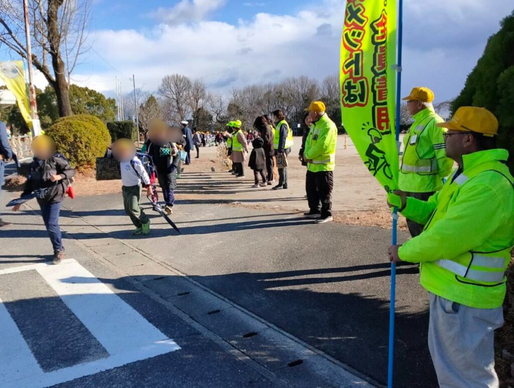 各務原地区交通安全協会では、令和7年12月26日の小学校終業式に合わせ、各務原市鵜沼大伊木町4丁目地内の各務原市立陵南小学校の校門付近において、のぼり旗を掲げ、下校する児童に声をかける等して、冬休み中の交通事故防止を呼びかけました。