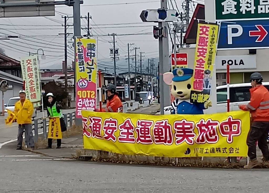 高山地区交通安全協会国府支部では、令和7年12月11日から12月20日までの年末の交通安全県民運動の活動として、令和7年12月14日、高山市国府町広瀬町地内の広瀬北交差点周辺において、のぼり旗や横断幕を掲げ、通行中のみなさんに交通安全を呼びかけました。