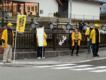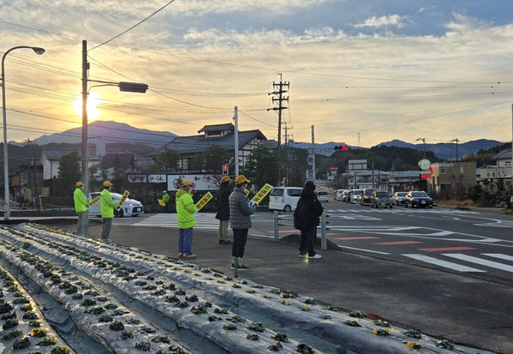 中津川地区交通安全協会苗木支部では、令和7年12月11日から12月20日までの年末の交通安全県民運動の活動として、令和7年12月11日と19日の二日間、中津川市苗木地内の主要交差点や通学路において、のぼり旗を掲げる等して、通行中のみなさんに交通安全を呼びかけました。