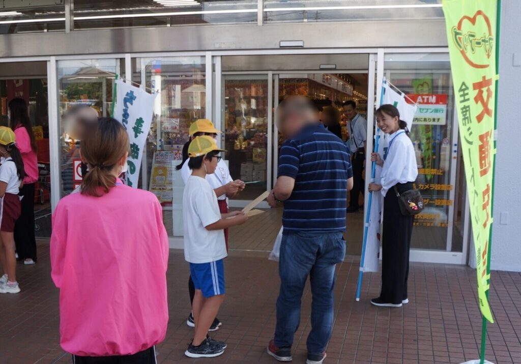 可児地区交通安全協会では、令和7年10月1日、可児市今渡地内のエディオン可児今渡店の店頭において、「交通安全レター作戦」として、交通安全の願いを込めた手紙と栞を可児市立今渡北小学校の児童が来店されたみなさんに手渡して、交通安全を呼びかけました。