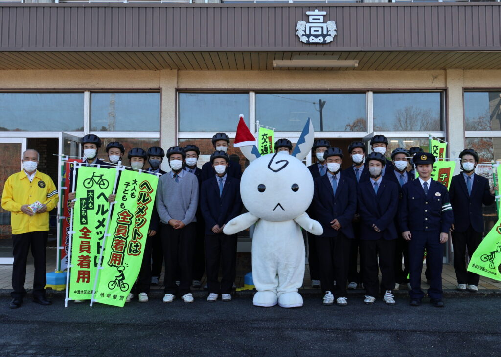 中濃地区交通安全協会では、令和7年12月11日から12月20日までの年末の交通安全県民運動の活動として、令和7年12月19日、関市桐ケ丘1丁目地内の関市立関商工高等学校において、同校野球部員の協力をいただき、同校生徒にチラシや交通安全グッズをお配りして、自転車の安全利用を呼びかけました。