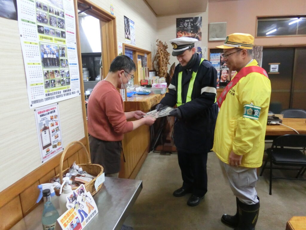 飛騨地区交通安全協会古川第二支部では、飲酒運転根絶キャンペーンとして飛騨警察署と合同で、令和7年12月4日、飛騨市古川町内の飲食店、宿泊施設やコンビニエンスストア等酒類提供業者を巡回し、チラシや交通安全グッズ等をお配りして、飲酒運転根絶を呼びかけました。