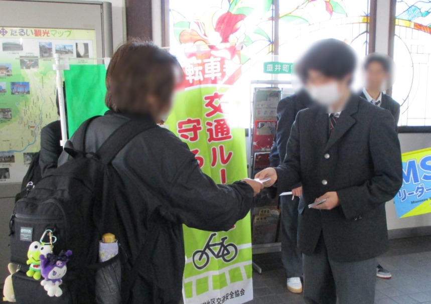 不破地区交通安全協会では、令和8年4月6日から4月15日までの春の全国交通安全運動の活動として、令和8年4月13日、不破郡垂井町のJR東海道線垂井駅構内において、岐阜県立垂井高校MSリーダーズの協力をいただき、駅利用者のみなさんに自転車の安全利用を呼びかけました。