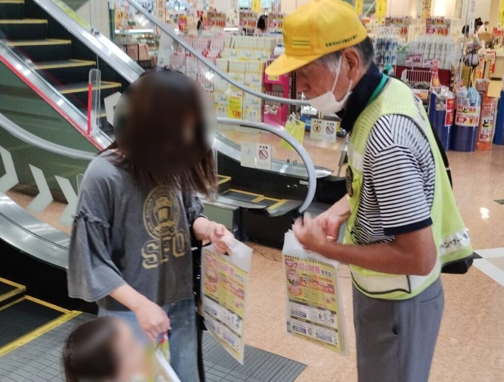 各務原地区交通安全協会では、令和7年10月9日、各務原市蘇原花園町3丁目地内のスーパーマーケット「大阪屋ショップ各務原店」店頭において、来店されたみなさんに交通安全グッズやチラシをお配りする等して、交通安全を呼びかけました。