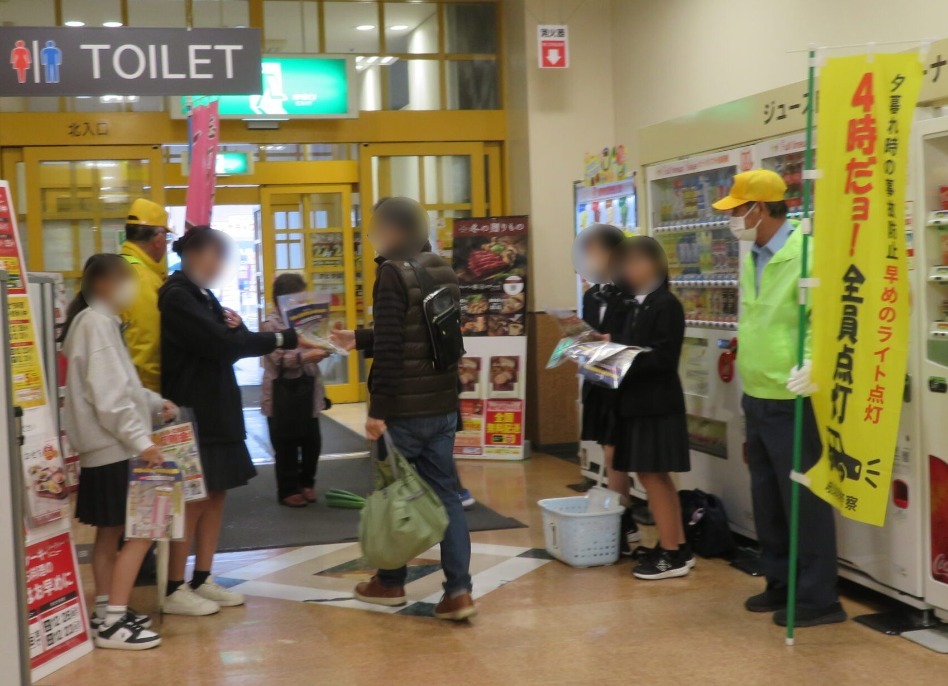 本巣地区交通安全協会では、令和7年12月3日、本巣郡北方町平成2丁目地内のショッピングモール「アピタ北方店」において、北方町立北学園と南学園のMSJリーダーズと協力して、来店されたみなさんにチラシや交通安全グッズをお配りして交通安全を呼びかけました。