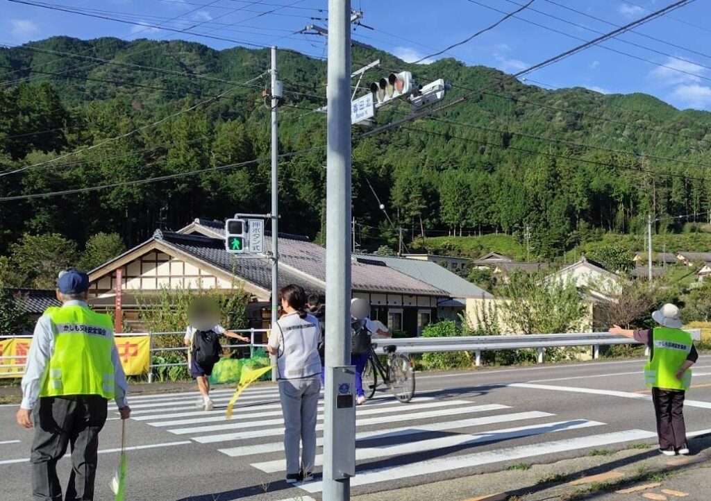 中津川地区交通安全協会加子母支部では、令和7年9月21日から9月30日までの秋の全国交通安全運動の活動として、令和7年9月22日、中津川市加子母地内の国道257号沿道において、通学児童・生徒の見守りを行い、横断幕やのぼり旗を掲げる等して通行中のみなさんに交通安全を呼びかけました。