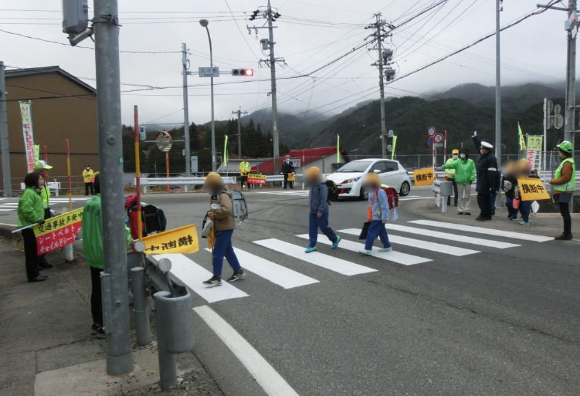 高山地区交通安全協会では、春の全国交通安全運動期間中の令和7年4月8日、地区内の通学路等において、交通安全旗を掲げるなどして児童・生徒の見守り活動を行い、通行中のみなさんに交通安全を呼びかけました。