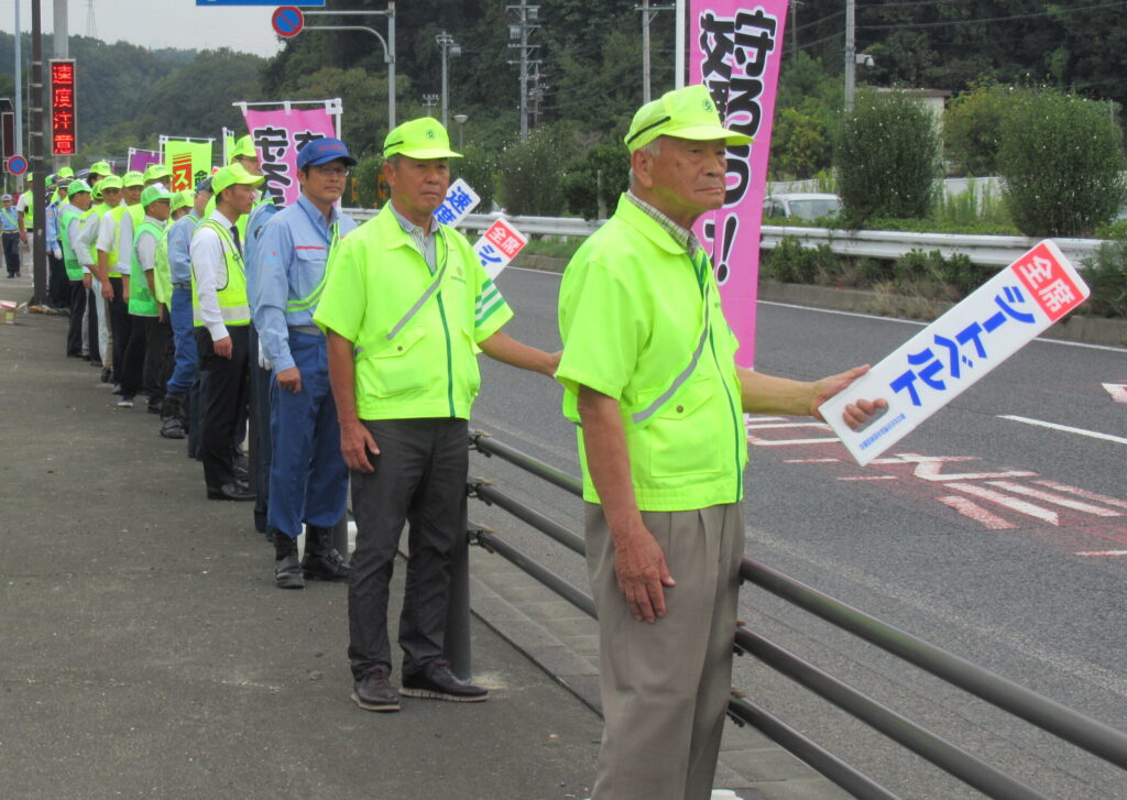 東濃地区交通安全協会では、令和7年10月7日、愛知県との県境である国道19号内津峠において開催された多治見市と愛知県春日井市との交通安全キャンペーン「T&K作戦」に参加し、のぼり旗やハンドプレートを掲げる等して、通行中のみなさんに交通安全を呼びかけました。