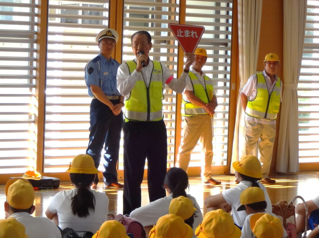 養老地区交通安全協会では、令和7年10月6日、養老郡養老町飯田地内の養老町立養北小学校において、西脇養老地区交通安全協会長が児童のみなさんに交通安全の話をした後、通学路で見守り活動を行いました。