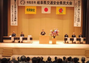 春の全国交通安全運動初日の令和8年4月6日、岐阜県庁みなもホールにおいて、岐阜県交通安全対策協議会の主催により、「令和8年岐阜県交通安全県民大会」が開催されました。大会では、交通安全功労者等の表彰が行われたほか、「交通安全の誓い」が採択されました。