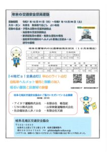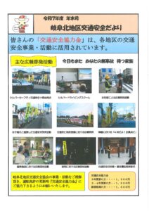 岐阜北地区交通安全協会では、岐阜北地区交通安全協会の活動状況や地区内の交通事故発生状況等を紹介した「岐阜北地区交通安全だより」年末号を発行しました。 地区交通安協会の活動は、みなさまからいただいた交通安全協力金で支えられています。運転免許更新時の交通安全協力金にご理解とご協力をお願いします。