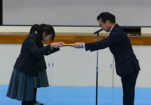岐阜県立岐阜清流高等特別支援学校が、令和7年11月1日付けで公益財団法人日本交通管理技術協会から自転車通学安全モデル校に指定されました。岐阜県交通安全協会では、令和7年11月22日に開催された同校の文化祭「清流祭」にうかがい、当協会加藤専務理事が「指定書」と「盾」を生徒代表に手渡ししました。