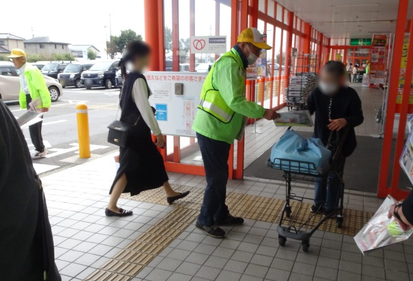 各務原地区交通安全協会では、令和7年10月9日、各務原市蘇原花園町3丁目地内のスーパーマーケット「大阪屋ショップ各務原店」店頭において、来店されたみなさんに交通安全グッズやチラシをお配りする等して、交通安全を呼びかけました。