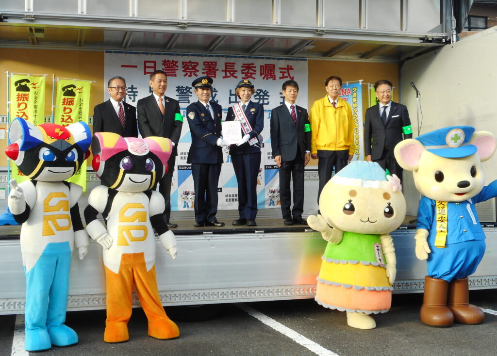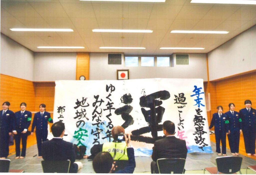 郡上地区交通安全協会では、令和7年12月11日、郡上警察署において開催された年末年始特別警戒出発式に参加しました。出発式では岐阜県立郡上高等学校書道部員が一日警察署長に委嘱され、書道パフォーマンスを披露しました。