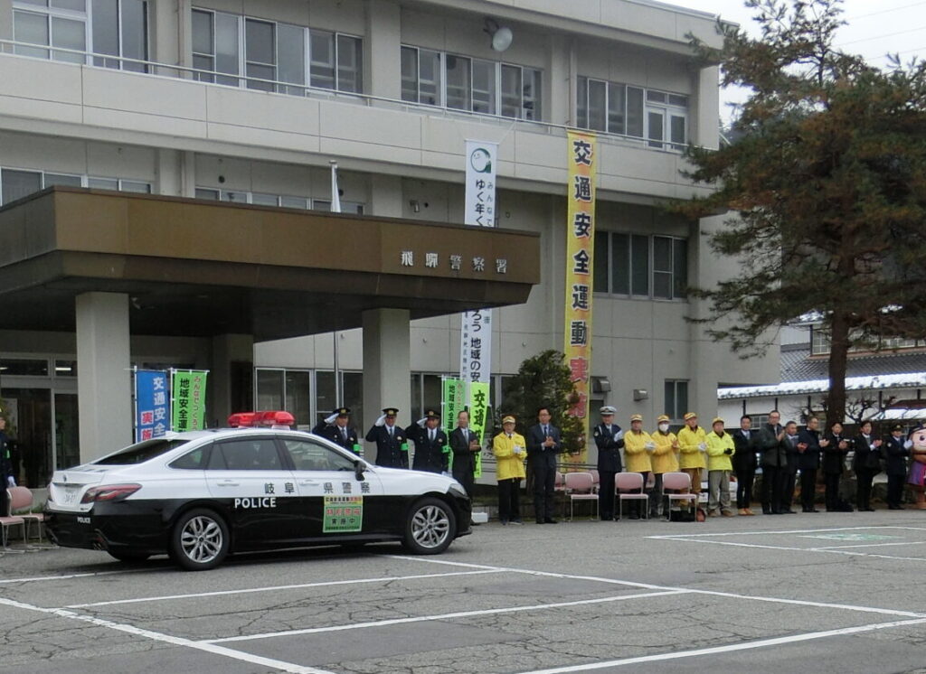 飛騨地区交通安全協会では、令和7年12月11日から12月20日までの年末の交通安全県民運動の活動として、令和7年12月11日、飛騨警察署において、年末の交通安全県民運動と年末年始地域安全運動との合同出発式を開催しました。