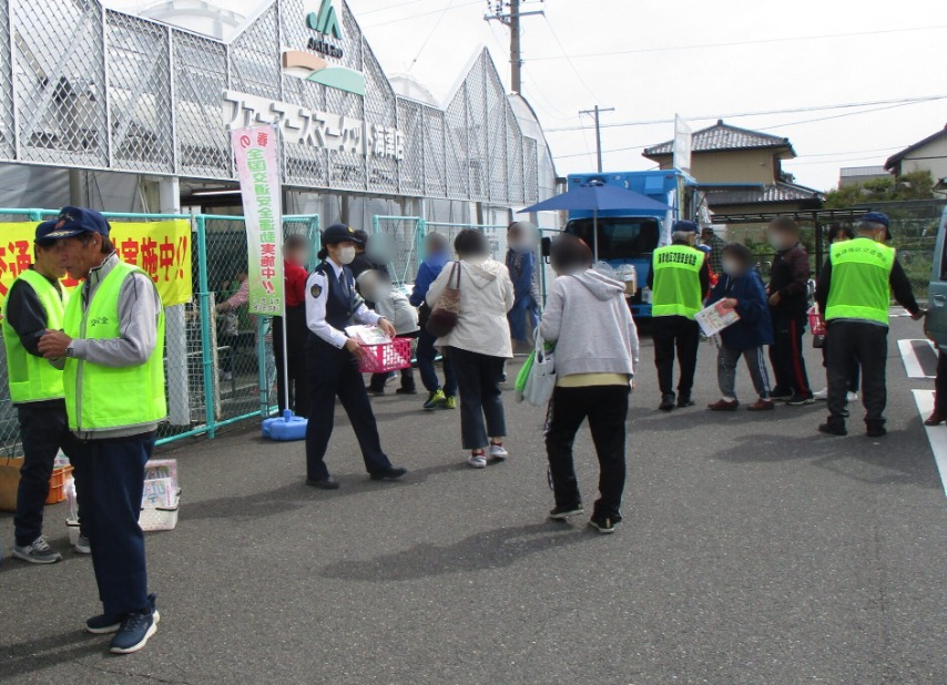 海津地区交通安全協会海津支部では、令和8年4月6日から4月15日までの春の全国交通安全運動の活動として、令和8年4月12日、海津市海津町馬目地内の農産物直売所「ファーマーズマーケット海津店」店頭において、来店されたみなさんにチラシや交通安全グッズ等をお配りして、交通安全を呼びかけました。