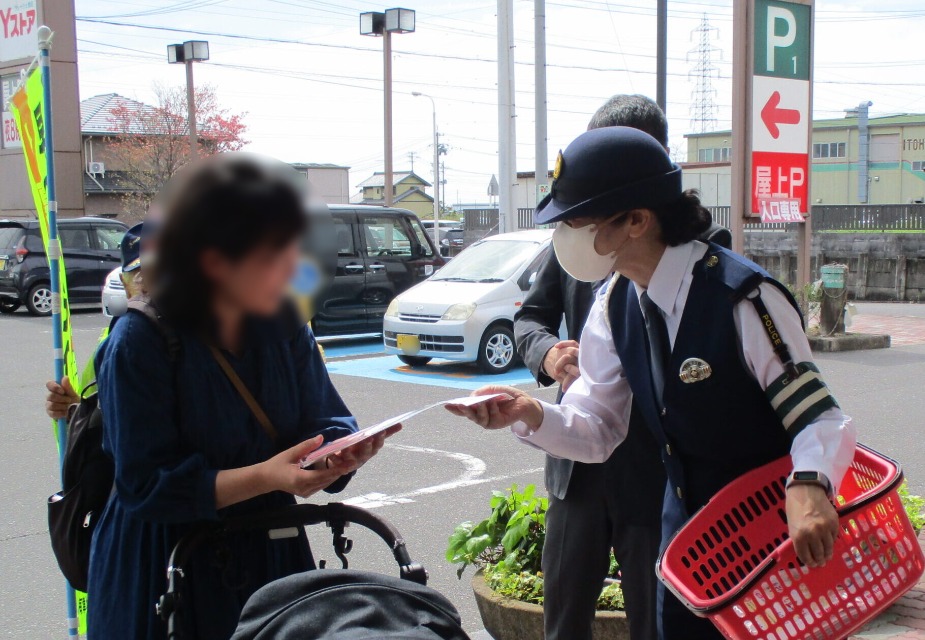 海津地区交通安全協会平田支部では、令和8年4月6日から4月15日までの春の全国交通安全運動の活動として令和8年4月12日、海津市平田町今尾地内のスーパーマーケット「ヨシヅヤ 海津平田店」店頭において、来店されたみなさんにチラシや交通安全グッズ等をお配りして、交通安全を呼びかけました。