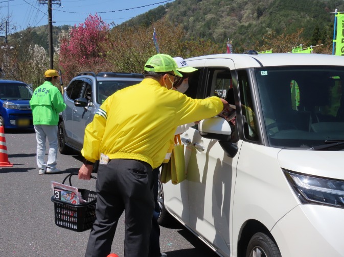 中津川地区交通安全協会では、令和8年4月6日から4月15日までの春の全国交通安全運動期間中の令和8年4月11日、中津川市山口地内の道の駅「賤母」において、隣接する長野県木曽地区交通安全協会と協力し、のぼり旗やハンドプレートを掲げ、通行中のみなさんにチラシや交通安全グッズをお配りするなどして交通安全を呼びかけました。