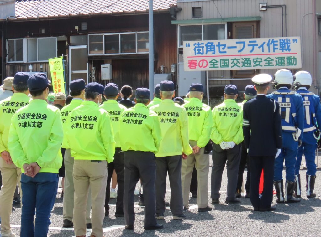 中津川地区交通安全協会では、令和8年4月6日から4月15日までの春の全国交通運動期間中の令和8年4月11日、中津川市えびす町地内の「ふるさとにぎわい広場」において開催された「街角セーフティ作戦」の開会式に参加し、式典後ショッピングセンターなどでチラシや交通安全グッズを配布して交通安全を呼びかけました。