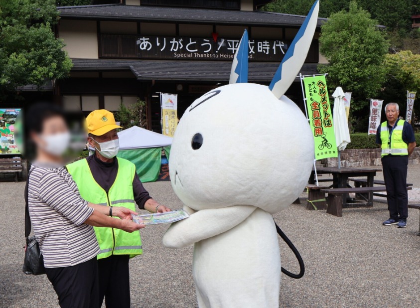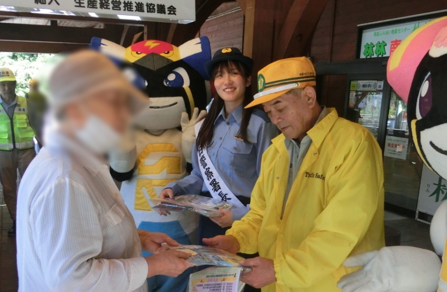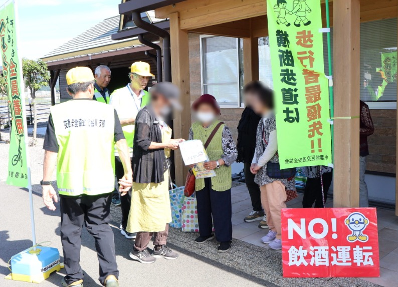 中濃地区交通安全協会では、令和7年9月21日から9月30日までの秋の全国交通安全運動の活動として、令和7年9月26日、関市武芸川町跡部地内の道の駅「むげ川」において、施設を利用されたみなさんに交通安全グッズやチラシなどをお配りして、交通安全を呼びかけました。