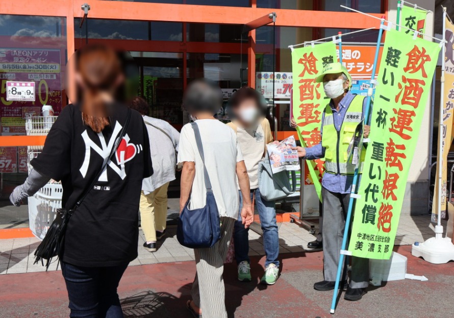 中濃地区交通安全協会では、令和7年9月21日から9月30日までの秋の全国交通安全運動の活動として、令和7年9月24日、関市大字小屋名字竹之腰地内のスーパーマーケット「ベイシア Foods Park 関店」店頭において、来店されたみなさんに交通安全グッズやチラシなどをお配りして、交通安全を呼びかけました。
