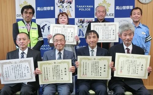 高山地区交通安全協会では、令和7年9月21日から9月30日までの秋の全国交通安全運動の活動として、令和7年9月24日、高山警察署において優良運転者表彰伝達式を開催し、交通安全功労者や優良運転者として中部管区警察局長と中部交通安全協会連絡協議会長との連名賞や交通栄誉賞緑十字銅章を受章された6名の方に表彰状等をお渡ししました。
