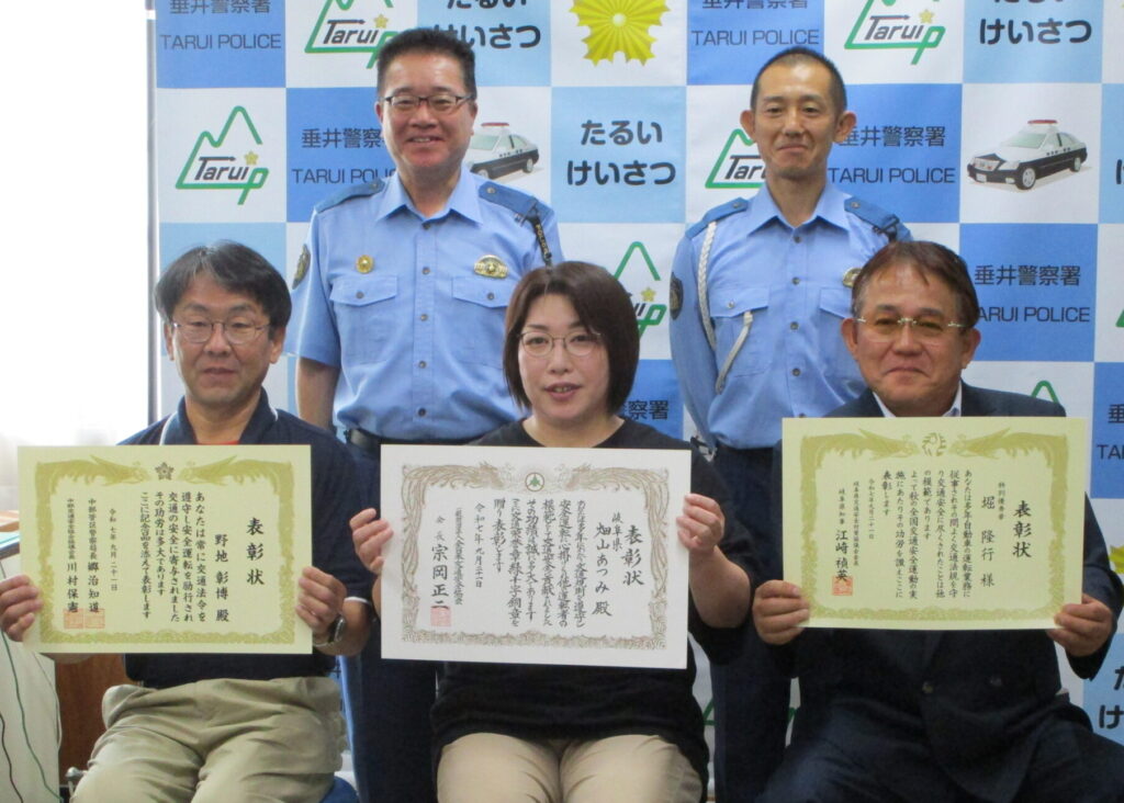 不破地区交通安全協会では、令和7年9月21日から9月30日までの秋の全国交通安全運動の活動として、令和7年9月22日、垂井警察署において優良運転者表彰伝達式を開催し、優良運転者として中部管区警察局長と中部交通安全協会連絡協議会長との連名賞、交通栄誉賞緑十字銅章や特別優秀賞を受章された3名の方に表彰状等をお渡ししました。