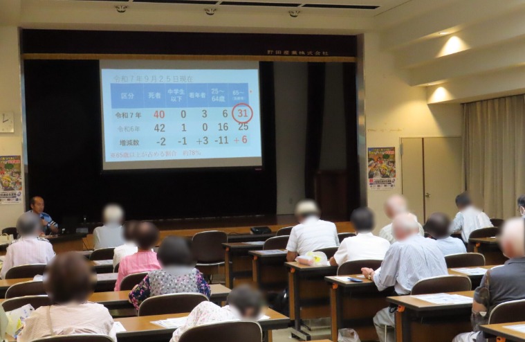 加茂地区交通安全協会では、令和7年9月21日から9月30日までの秋の全国交通安全運動の活動として、令和7年9月26日、加茂郡富加町滝田地内の「タウンホールとみか」において富加地区高齢者交通安全大学校の9月講座を開催しました。