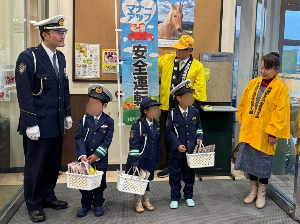 下呂地区交通安全協会では、令和8年4月6日から4月15日までの春の全国交通運動期間中の令和8年4月10日、下呂市萩原町花池地内のスーパーマーケット「バロー下呂店」において、この日下呂警察署長から任命された「一日ちびっこ警察官」とともにチラシや交通安全グッズをお配りする等して、来店されたみなさんに交通安全を呼びかけました。