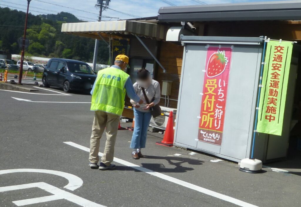 山県地区交通安全協会では、令和8年4月6日から4月15日までの春の全国交通運動期間中の令和8年4月14日、山県市小倉地内の農産物直売所「てんこもり」において、来店されたみなさんにチラシや交通安全グッズをお配りして交通安全を呼びかけました。