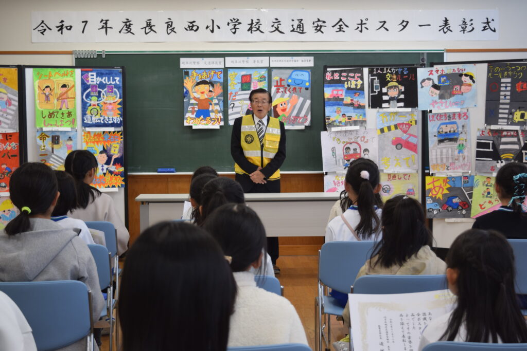 岐阜北地区交通安全協会では、令和7年12月11日から12月20日までの年末の交通安全県民運動の活動として、令和7年12月12日、岐阜市千代田町2丁目地内の岐阜市立長良西小学校において、同校児童が作成した交通安全ポスター表彰式を開催しました。上位3作品については、来年1月末まで岐阜北警察署のエントランスホールに掲示されます。