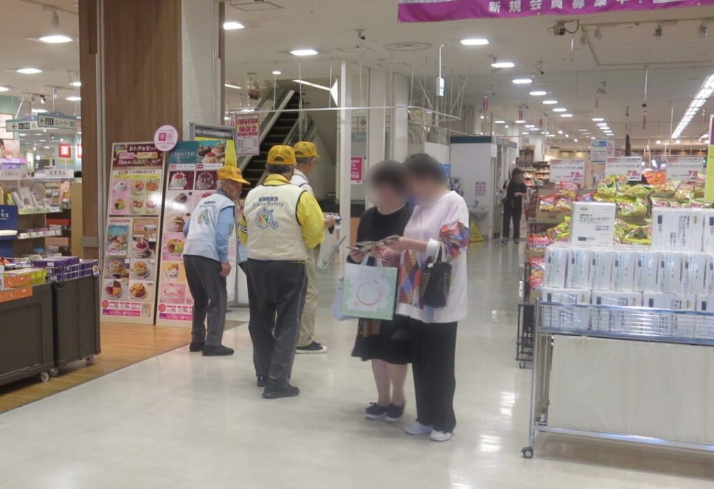 岐阜羽島地区交通安全協会では、高齢者の関連する交通事故が多発傾向にある岐阜市柳津町地区と羽島郡笠松町地区において「高齢者見守り隊」を発足させ、令和7年10月23日、岐阜市柳津町本郷4丁目地内のスーパーマーケット「イオン柳津店」において、高齢者見守り隊員が来店者のみなさんにチラシや交通安全グッズをお配りして、高齢者の交通事故防止を呼びかけました。