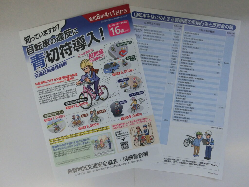飛騨地区交通安全協会では、令和8年4月1日から自転車への交通反則通告制度が適用されることから、この内容を広報するチラシを作成し、地区内の中学校と高等学校に配布しました。