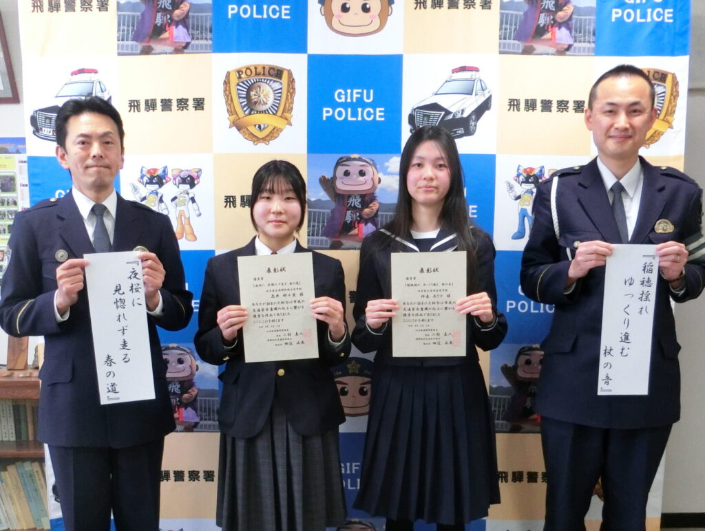 飛騨地区交安全協会では、飛騨警察署との共催で地区内の岐阜県立神岡高等学校と岐阜県立吉城高等学校の生徒から「交通安全俳句」を募集し、令和8年3月9日、飛騨警察署において、優秀賞を受賞した花井那々美さんと仲表ありすさんに、表彰状を贈りました。