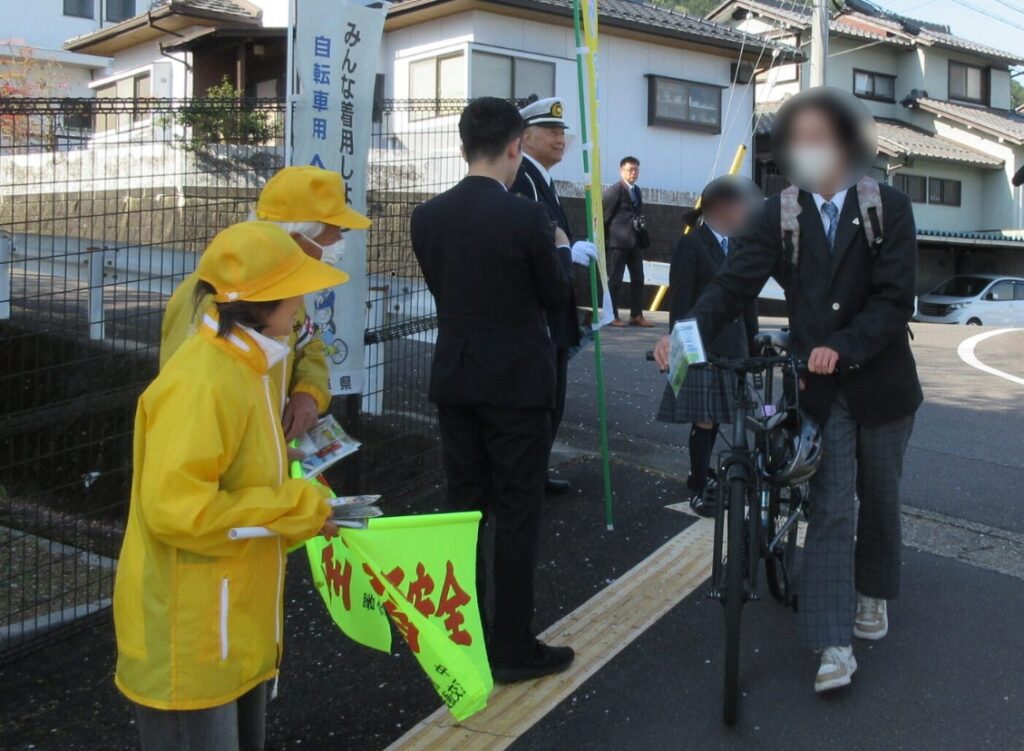 岐阜中地区交通安全協会では、令和8年4月6日から4月15日までの春の全国交通安全運動の活動として令和8年4月9日、岐阜市芥見南山3丁目地内の岐阜県立岐阜清流高等特別支援学校正門前において、交通安全旗やのぼり旗を掲げる等して、自転車利用者のみなさんに自転車の安全利用を呼びかけました。