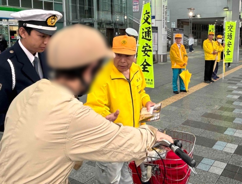 岐阜中地区交通安全協会では、令和8年4月6日から4月15日までの春の全国交通安全運動の活動として令和8年4月15日、岐阜市神田町9丁目地内の名鉄岐阜駅周辺において、のぼり旗を掲げ、自転車利用者のみなさんにチラシや交通安全グッズをお配りする等して、自転車の安全利用を呼びかけました。