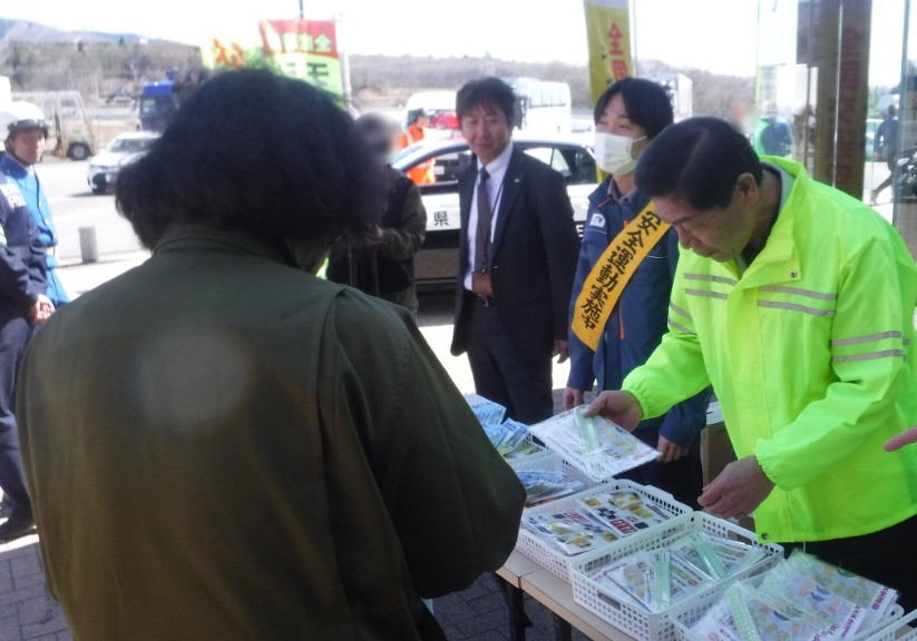 郡上地区交通安全協会では、令和8年4月6日から4月15日までの春の全国交通安全運動期間中の令和8年4月8日、東海北陸自動車道ひるがの高原サービスエリアにおいて、ネクスコ中日本や警察と協力して、サービスエリア利用のみなさんに交通安全グッズやチラシをお配りする等して交通安全を呼びかけました。